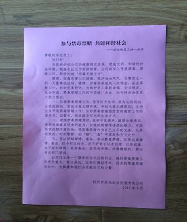 为广泛开展禁毒、禁赌宣传教育活动,加强公司平安建设,进一步提高员工对毒品、赌博危害的认识,防止和杜绝吸毒人员的滋生,抵御毒品的侵害和赌博带来的危害,公司采取多种形式的宣传方式,充分利用现有的禁毒资料,向员工进行禁毒、禁赌宣传,发动员工积极参与禁毒、禁赌斗争,在公司内营造浓厚的氛围,提高居民群众防范意识,增强员工的法制观念和识毒、拒毒、防毒、拒赌意识,提高员工对毒品、赌博的抵制能力,努力营造一个健康和谐的良好氛围。