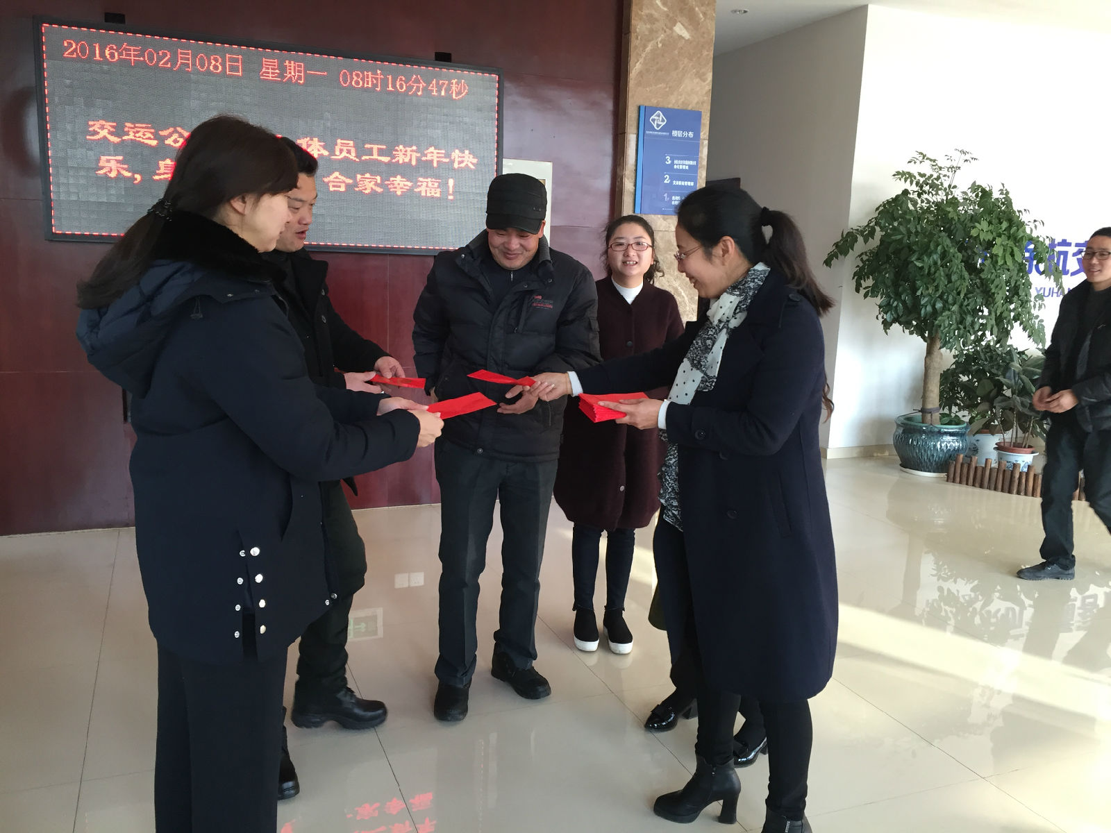 羊随新风辞旧岁,猴节正气报新春。大年初一一大早,交运公司暖意融融,交运部副经理陈建娣向仍坚守在工作岗位的员工及司机拜年,并送上亲切的慰问浓浓的祝福,开门红包给交运部大厅增添了更多的喜庆气氛。她感谢大家在过去一年所付出的辛勤劳动,勉励大家在新的一年里再接再励,力争上游,以G20峰会为契机,制定新目标,创造新成绩,展现新风貌,积极推动服务品质不断提升。春运期间,要做到不拒载、不宰客、无重大投诉及事故,着力保证市民安全、快捷出行,顺利圆满完成春运各项安全生产任务。