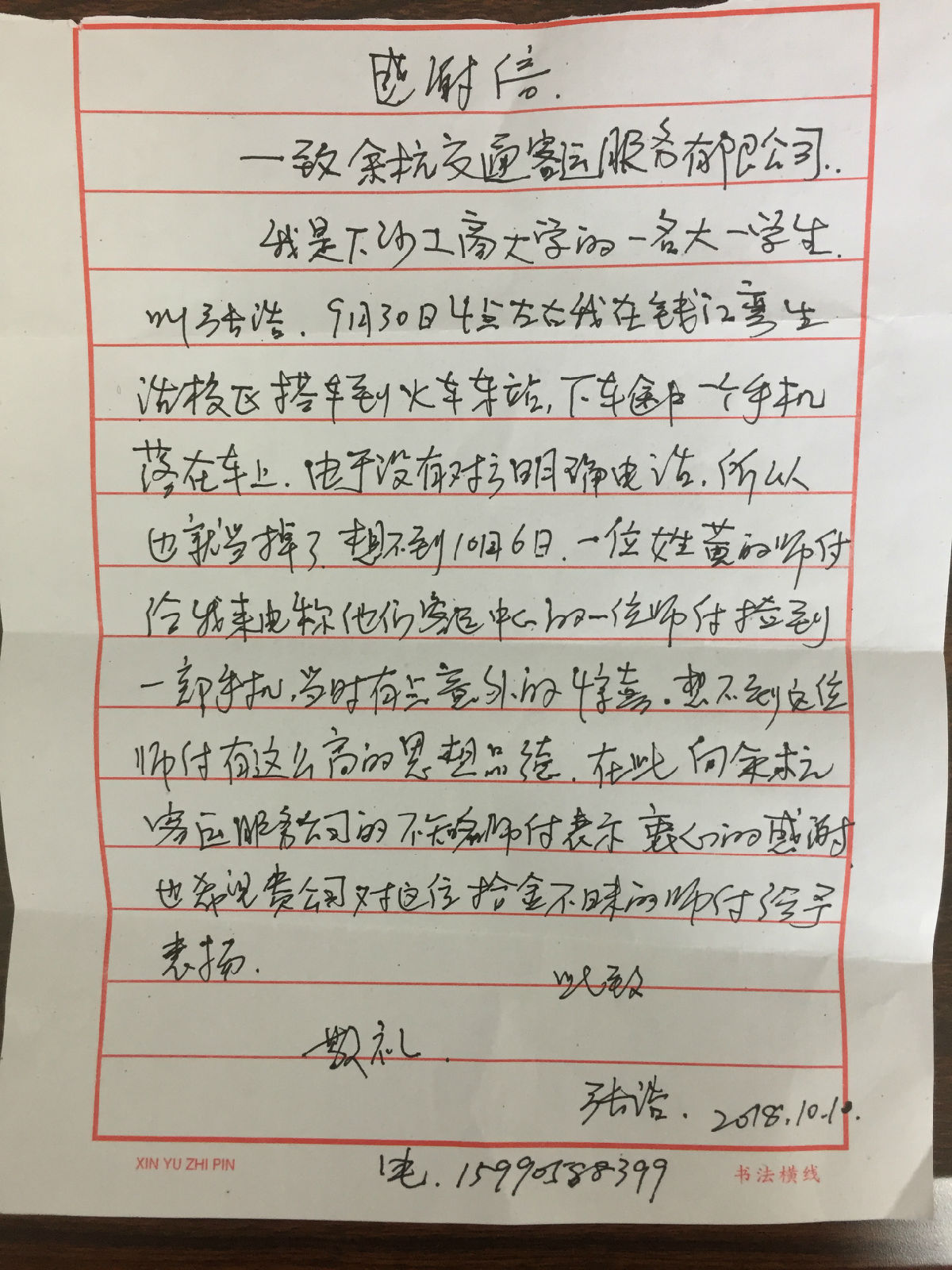 当张浩同学收到快递到家的手机,被司机和工作人员的高尚品格深深感动,洋洋洒洒写下感谢信,也通过快递的方式传递对驾驶员拾金不昧行为的感激之情!